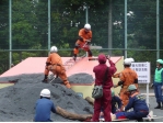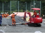 天候不順の中、品川区・西大井公園におきまして「品川区・三署合同水防訓練」が行われました。三署というのは、品川区役所、品川消防署、消防団の三者で、品川区に流れる立会川が氾濫したという想定で行われました。写真は品川区役所の女性職員によります訓練で、立会川に見立てた氾濫箇所を土嚢でせき止めているところです。みなさん真剣そのものです。