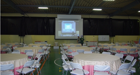 当社では映像と音響を請負ました。映像はスクリーンはもちろん生カメラにDVDとPCの3入力でスイッチャーで切り替えて送出しました。会場はかなり広かったのですが210インチのスクリーンでバッチリ見えました。